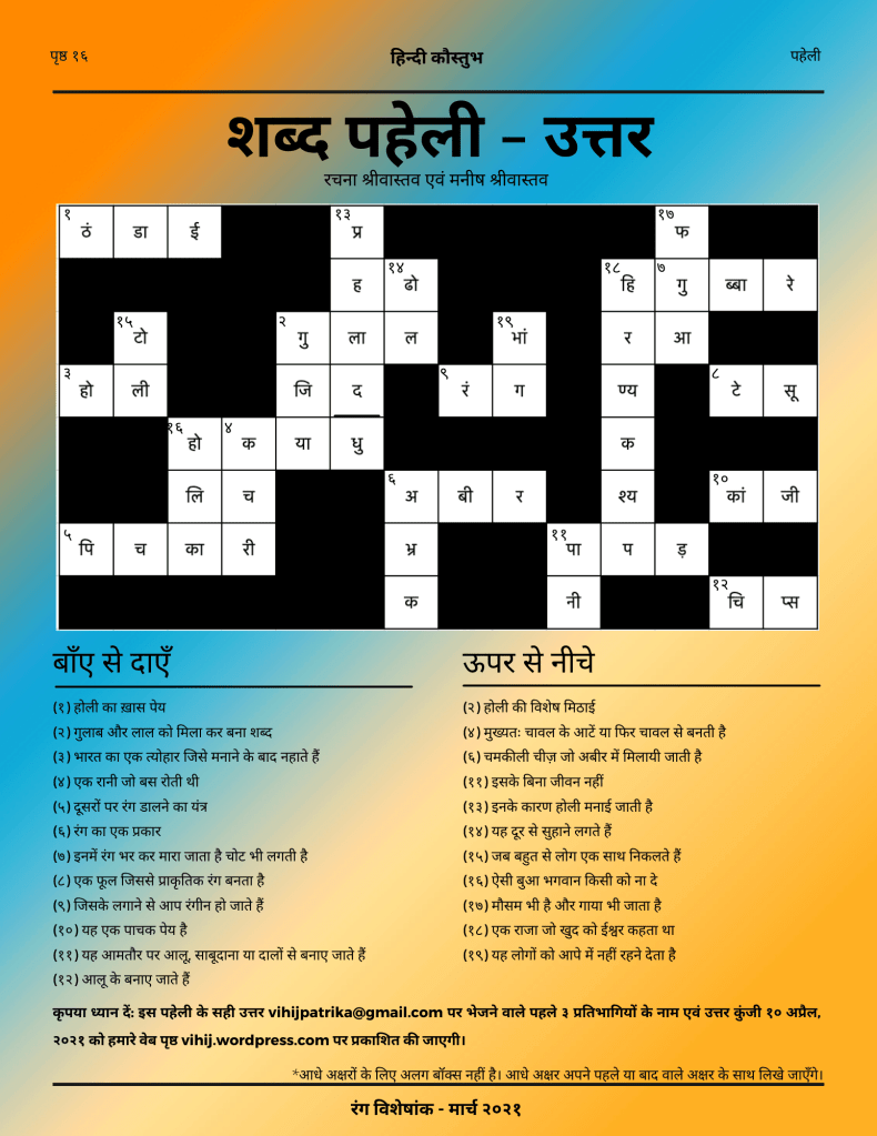 हिन्दी कौस्तुभ मार्च २०२१ – रंग विशेषांक में पृष्ठ १६ पर प्रकाशित शब्द पहेली के उत्तर।